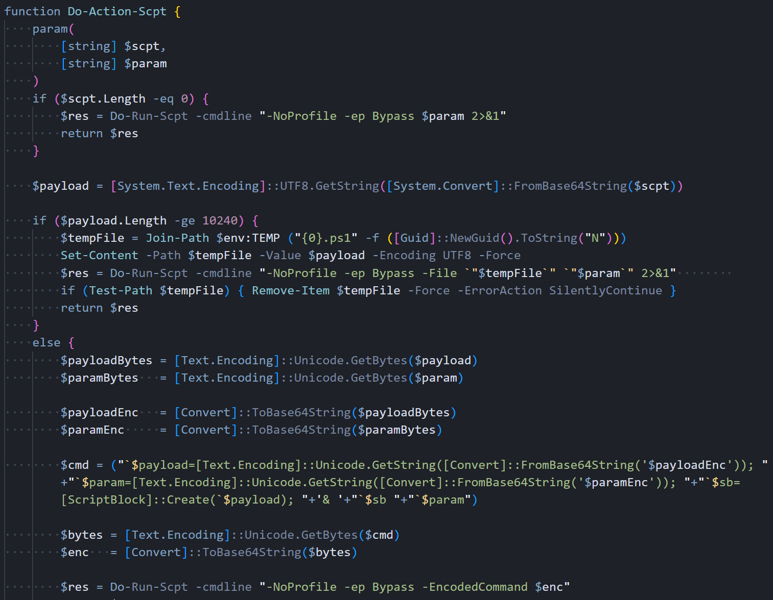 The content gets double-encoded (UTF-16 then Base64) and passed through PowerShell's -EncodedCommand flag, keeping everything entirely in memory with no filesystem artifacts. Larger scripts that exceed command-line length limits get written to a temporary .ps1 file with a random GUID filename in %TEMP%, executed via the -File parameter, and immediately deleted afterward.