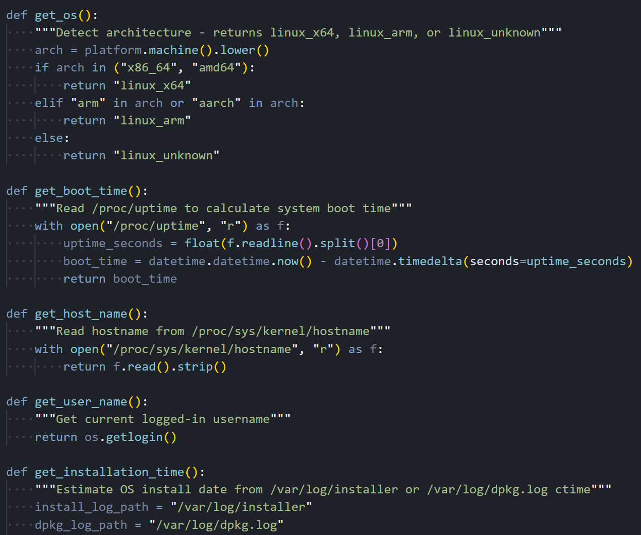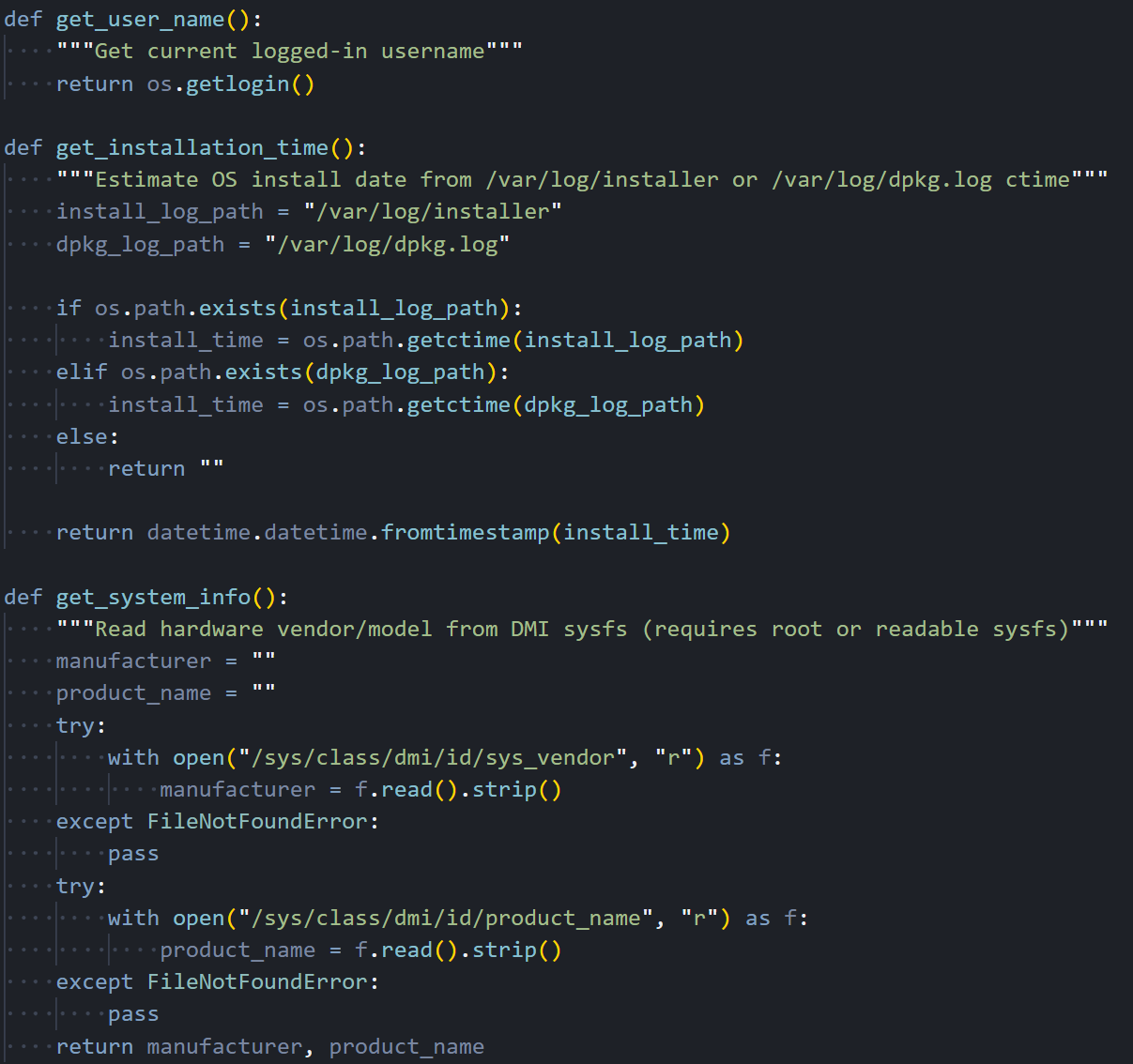 Figure 16: System info collection: get_installation_time() via dpkg logs, get_system_info() reading /sys/class/dmi for vendor and product nameProcess Enumeration