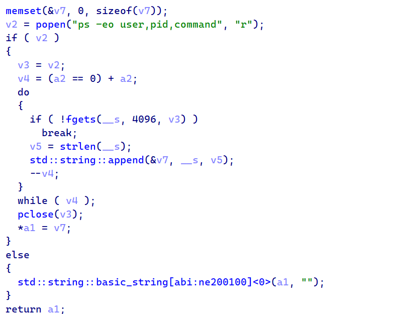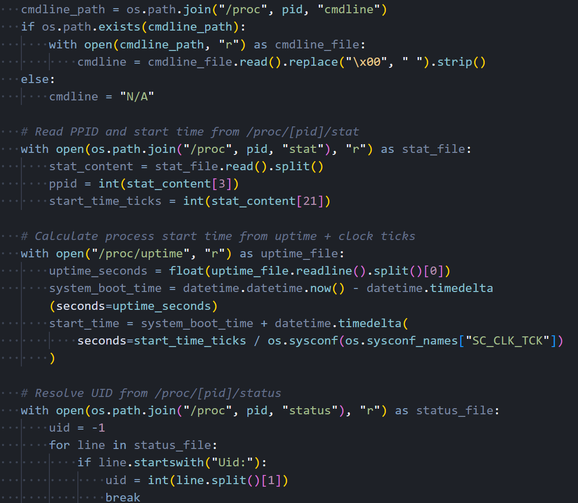 Where the Windows variant uses WMI to enumerate processes, the Linux RAT walks the /proc filesystem directly. For each numeric directory under /proc (each one representing a running process), it reads the full command line from /proc/[pid]/cmdline (where null bytes separate the arguments), extracts the parent PID and process start time from /proc/[pid]/stat, reads the effective UID from /proc/[pid]/status, and resolves that UID to a username by parsing /etc/passwd line by line. It's more work than calling a single WMI query, but it achieves the same result without any external dependencies.
