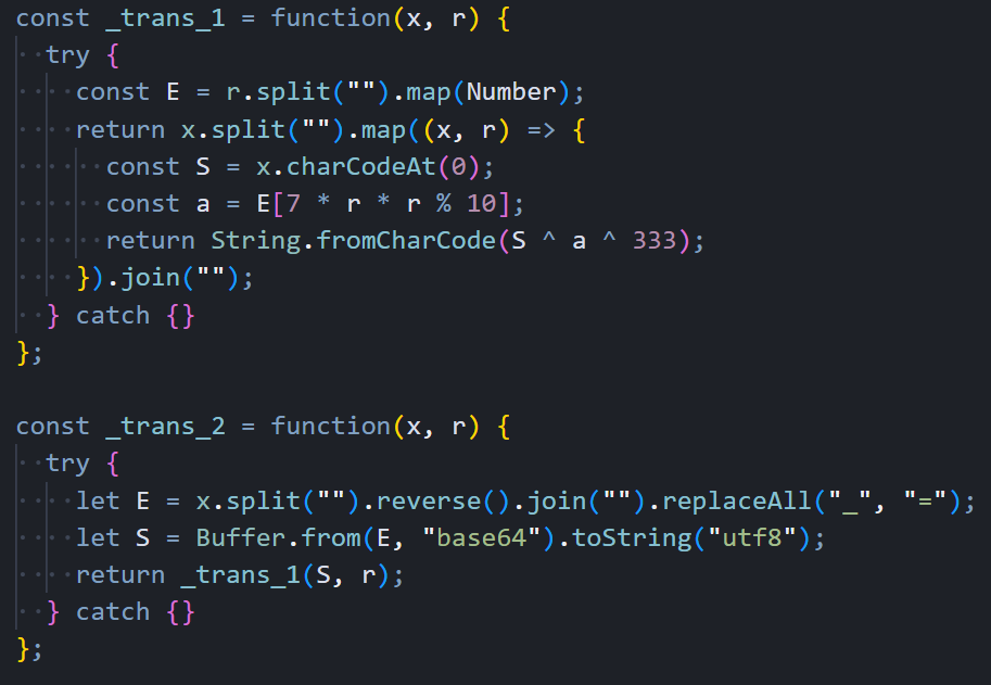 Figure 2: The two decryption functions that unpack the stq[] array at runtime. a XOR cipher combined with reversed Base64 encodingThe decoded array also contained the dropper's anti-forensics targets: the filenames package.json (which it deletes) and package.md (a clean replacement stub that gets renamed into place). Even the file extensions for the Windows payload chain. .exe, .ps1, .vbs. were stored encrypted, leaving absolutely nothing readable in the source code.