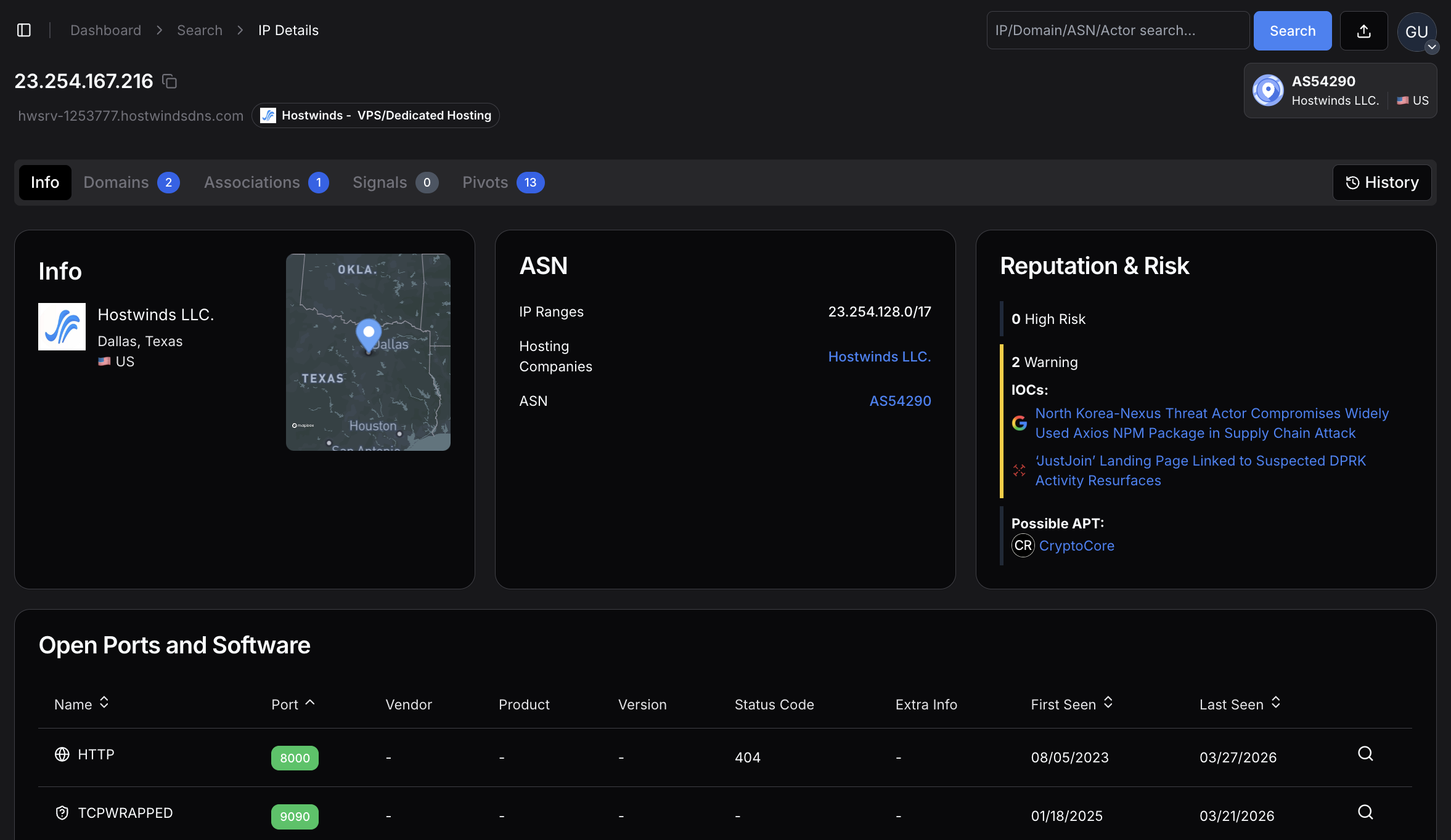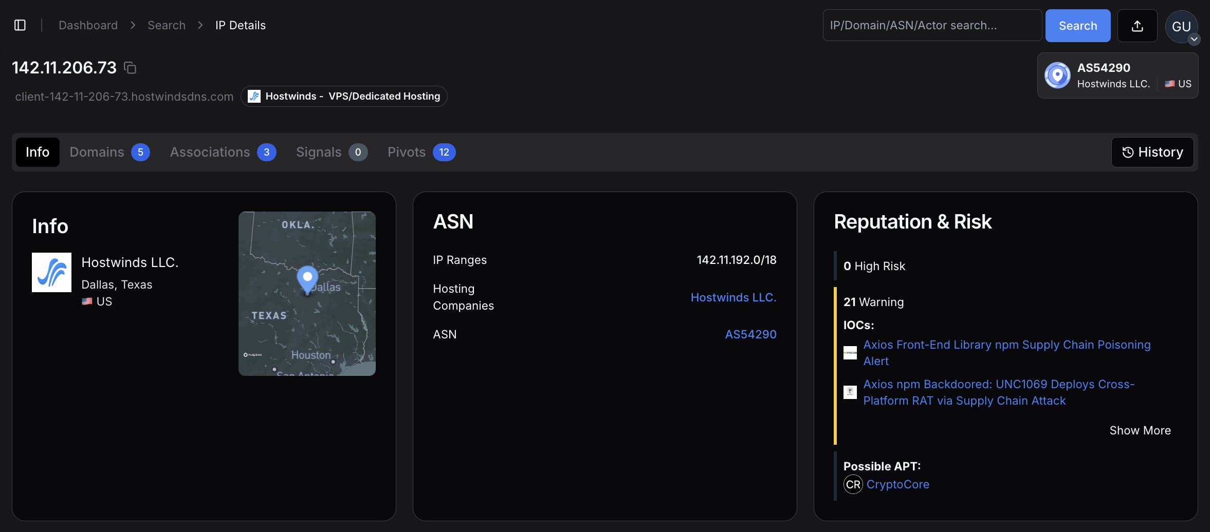 Figure 28: overview for 142.11.206[.]73. the Axios C2 server hosted on Hostwinds LLC in Dallas, Texas, AS54290, within the 142.11.192.0/18 subnet that contains confirmed Lazarus infrastructureHostwinds is the most frequently observed hosting provider in Hunt.io's tracking of TA444/BlueNoroff operations. The provider offers affordable VPS instances with minimal identity verification and accepts cryptocurrency payments, making it attractive for threat actors who need disposable infrastructure that's quick to provision and hard to trace back. The provider profile below shows the hosting characteristics that make it a repeated choice for this threat group.