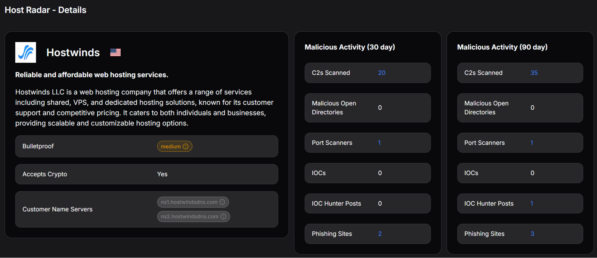 Figure 29: Hostwinds provider profile showing cryptocurrency payment acceptance, medium bulletproof rating, and detected malicious activity, including C2 scanning and phishing sitesThe combination of the same ASN, the same /18 subnet, a shared unique ETag with a documented DPRK server, and the use of Hostwinds (BlueNoroff's most common hosting provider) creates a strong infrastructure link that's difficult to explain as a coincidence.