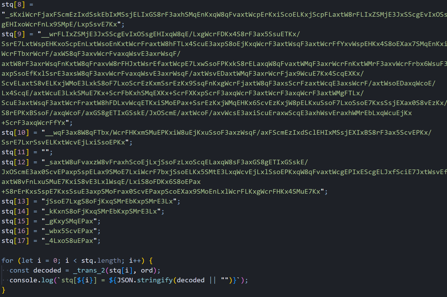 Figure 3: Output from our decoder script showing the full contents of all 18 stq[] entries after decryptionWith the string table decoded, the dropper's execution flow becomes straightforward. It dynamically imports the three Node.js modules using the decrypted names, constructs the full C2 URL by appending the campaign identifier "6202033" to the base URL, calls os.platform() to figure out which operating system it's running on, and branches into one of three completely different delivery paths. The deobfuscated version below makes the logic clear. This is the same code, just with every encrypted string replaced by its decoded value.