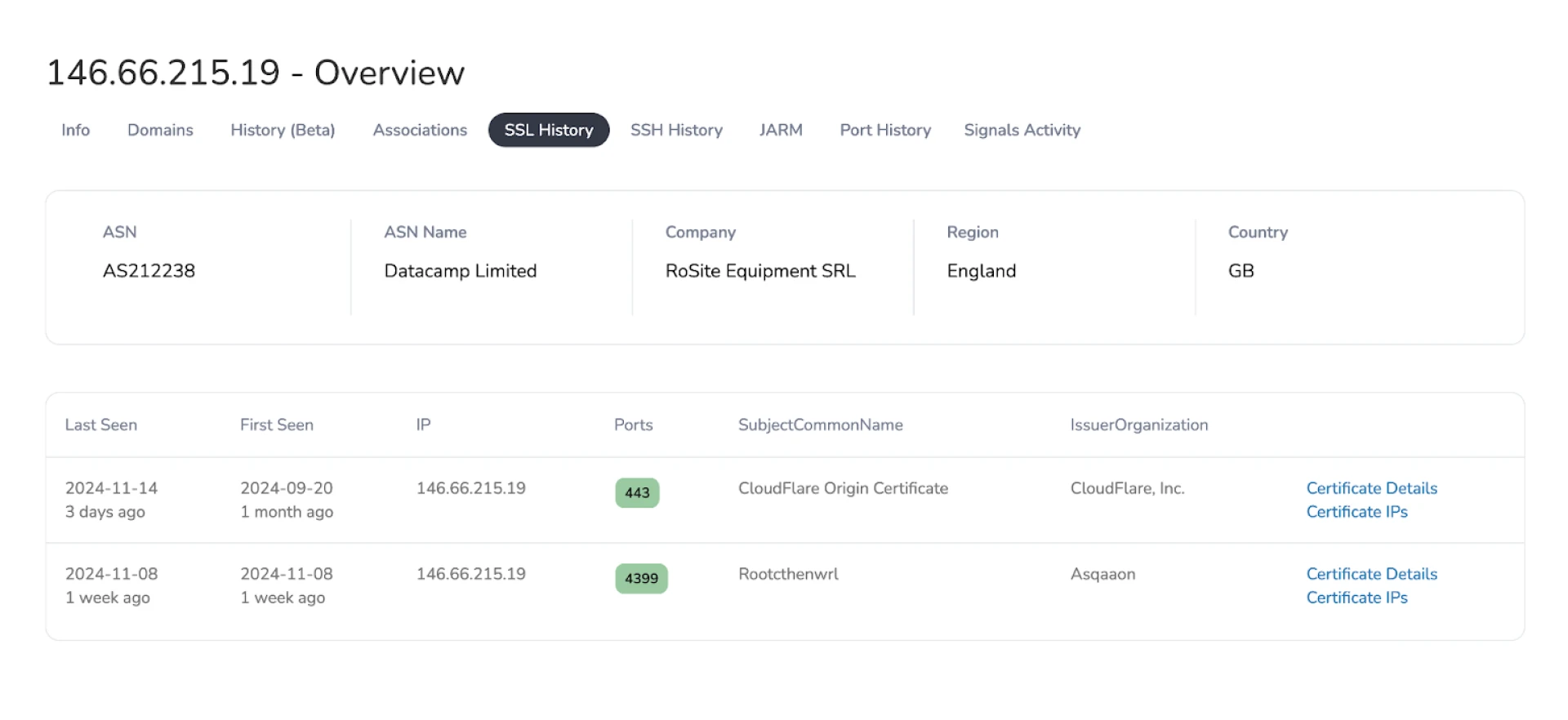 Figure 8: SSL History overview for 146.66.215[.]19 (Hunt).