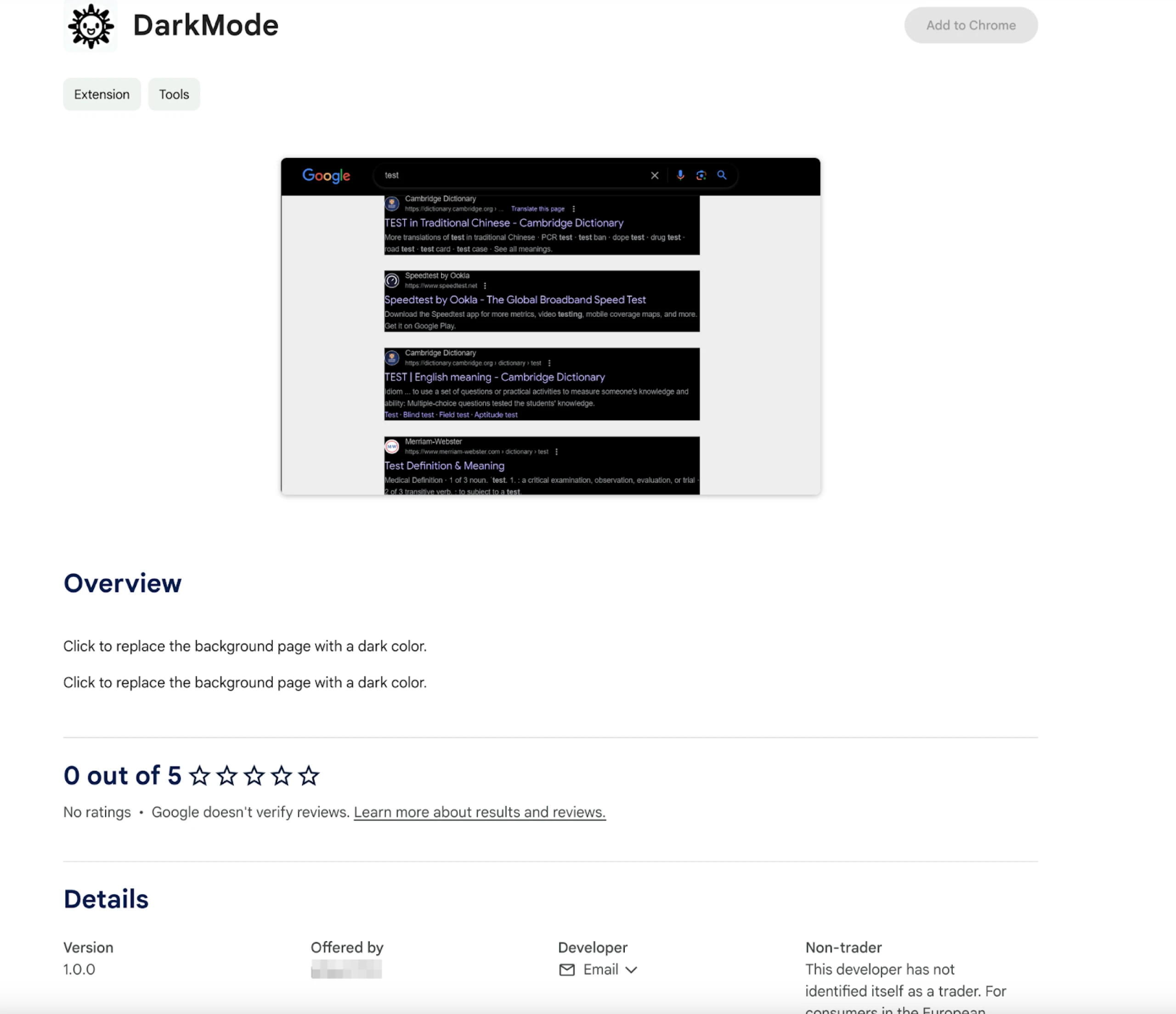 Interestingly, there is another dark mode-themed extension in the Chrome Web Store with the exact identifier used in the script.