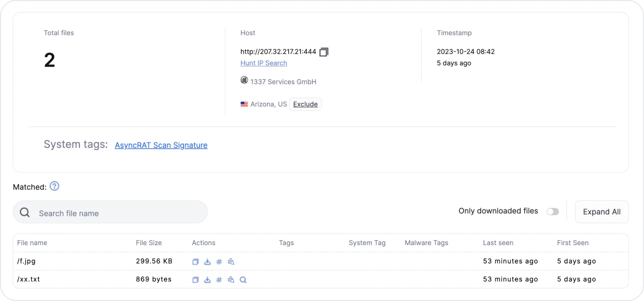 Recently, Hunt identified a malicious IP address serving AsyncRAT that hosted two files in an open directory.