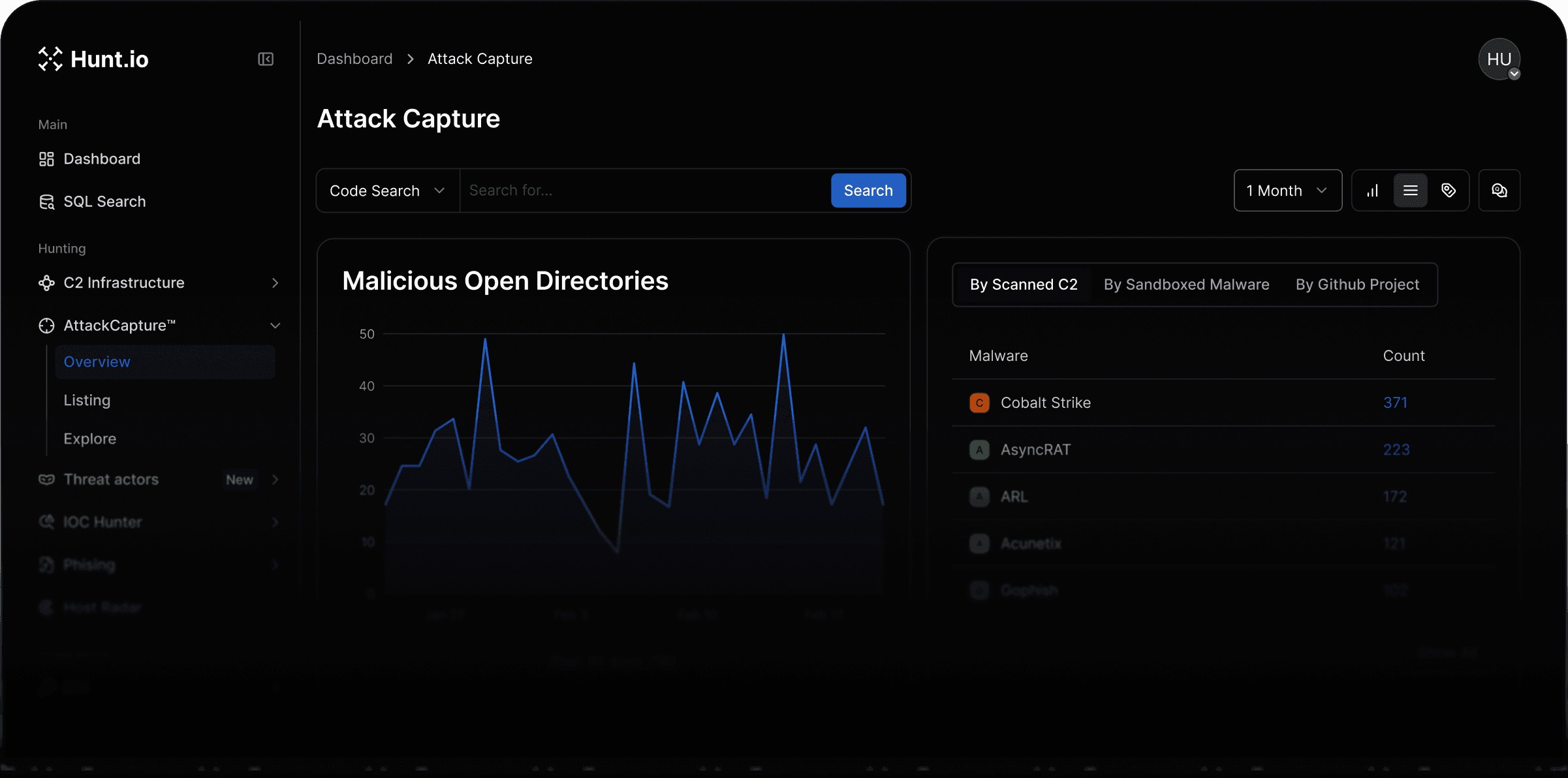 Hunt.io maps active C2 servers, payload hosts, phishing kits and exposed assets using first-party scanning and validation to reveal threats others miss.