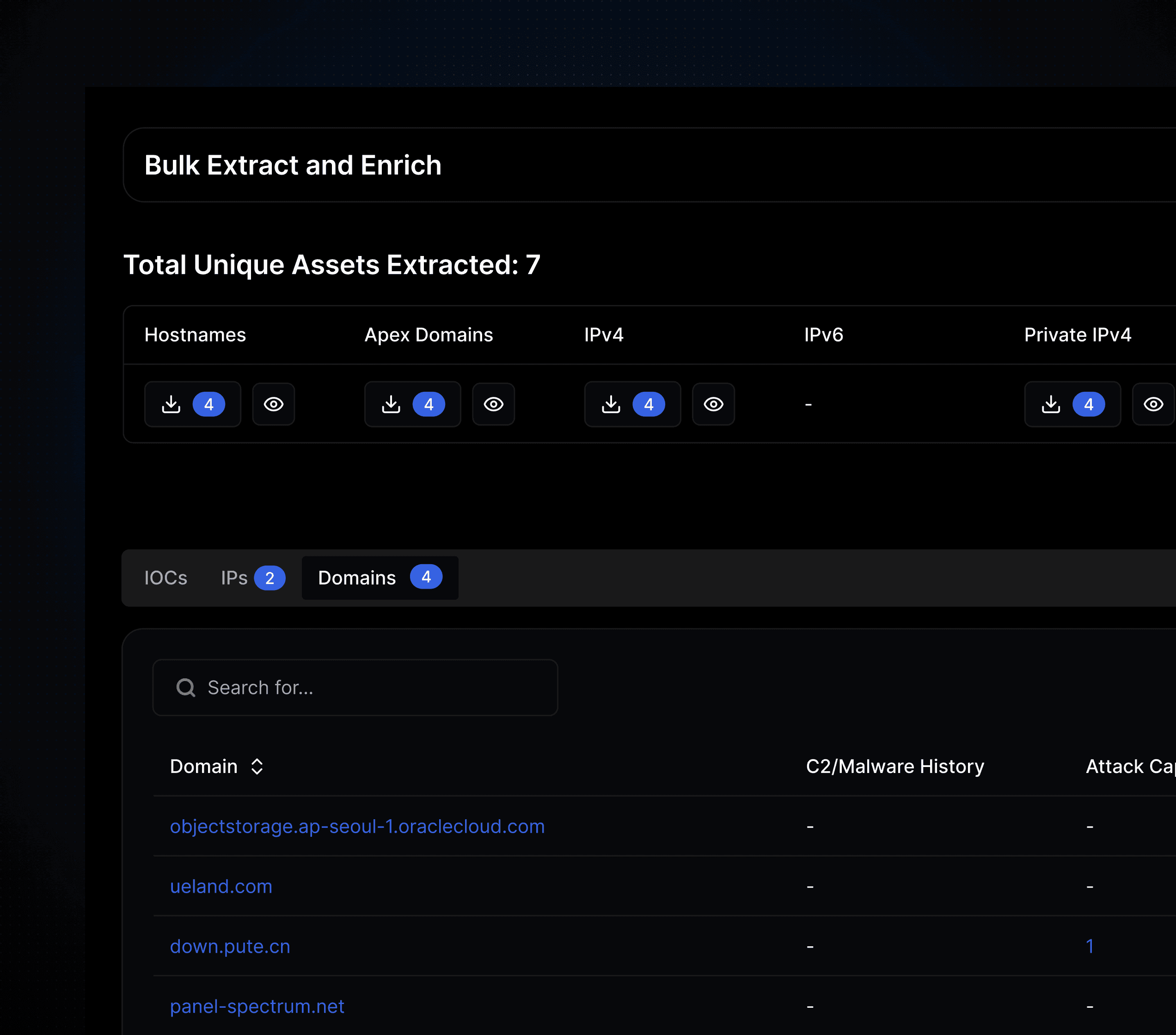 You can upload text files or paste raw text containing indicators such as IP addresses and domains for automatic extraction and enrichment.