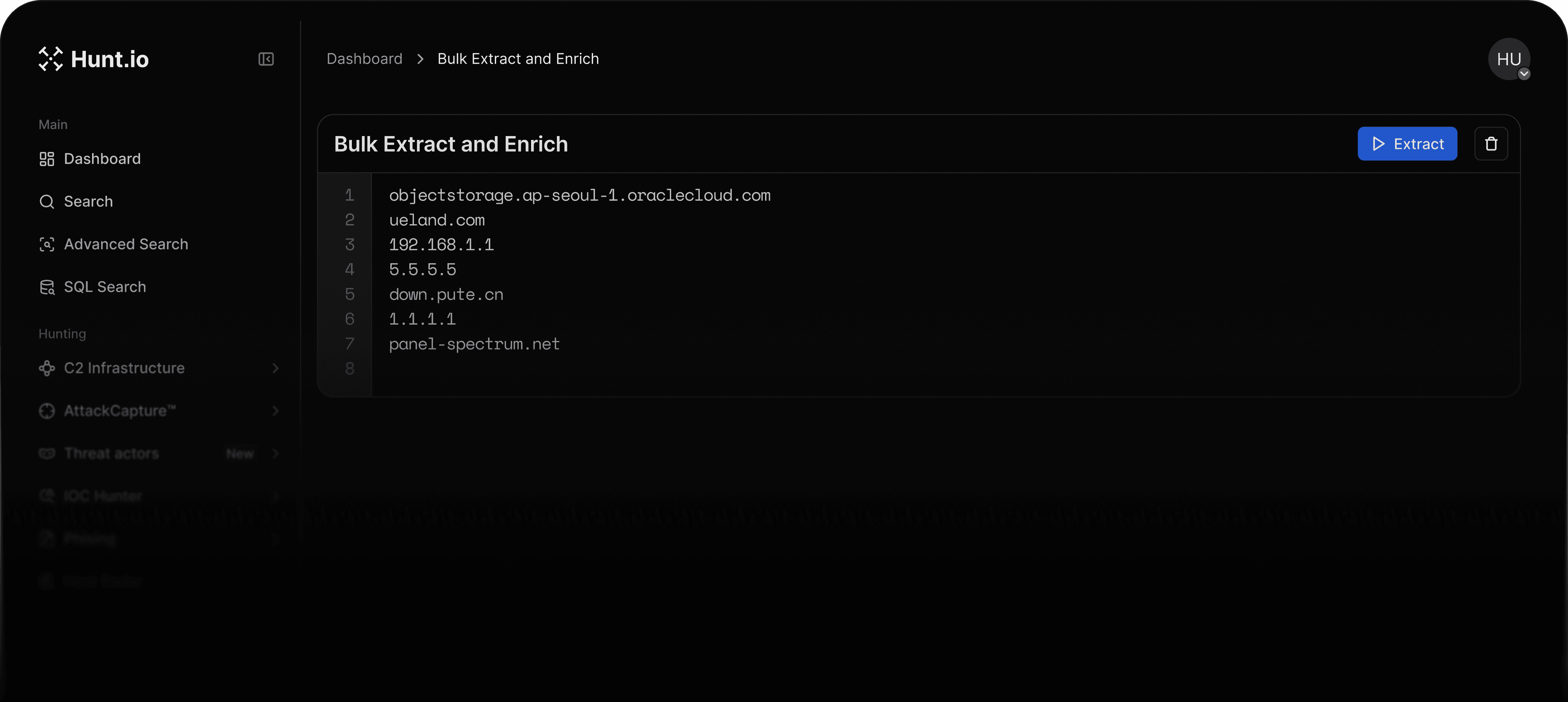 Hunt turns unstructured text into enriched IP and domain data you can use immediately in investigations.