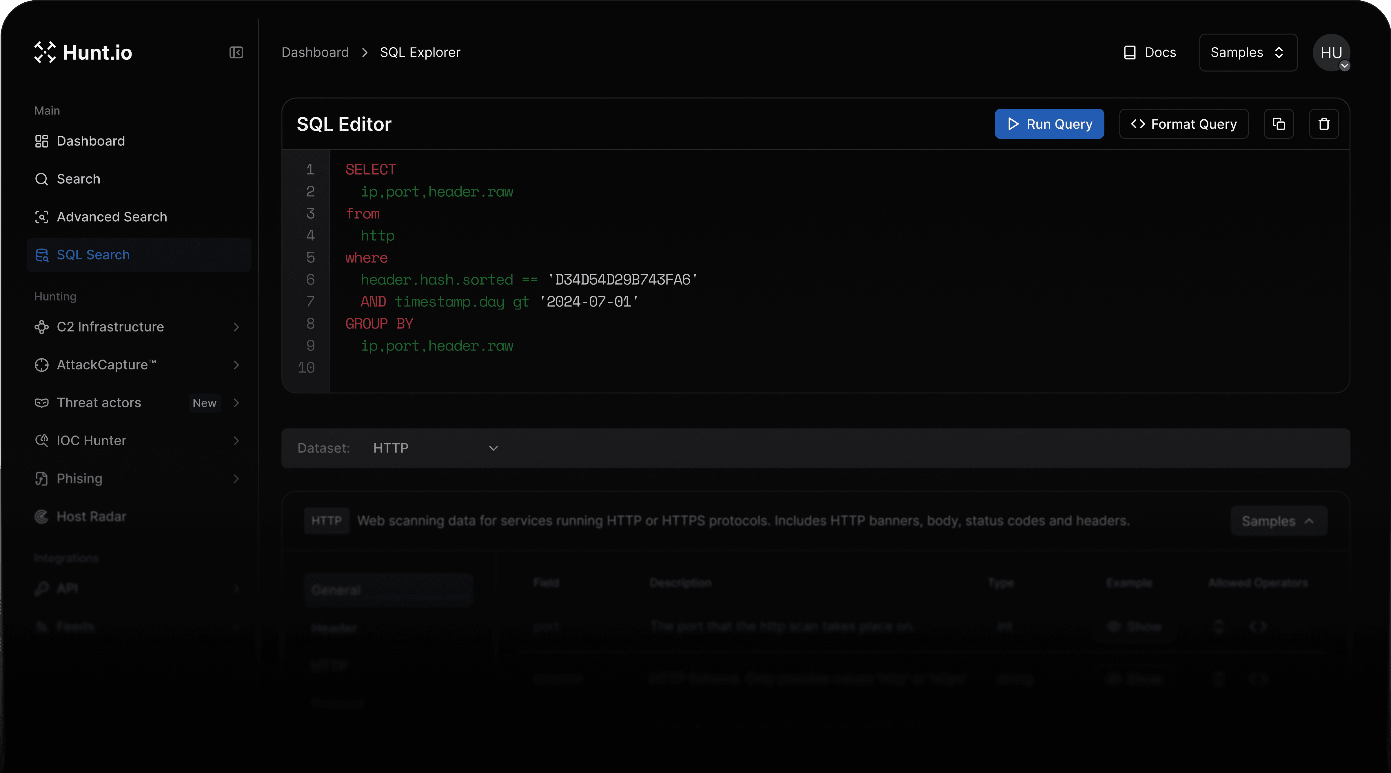 Users can query the Hunt database of confirmed C2 servers and build detailed statistics on threat actor activity.