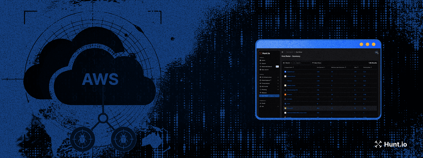 Host Radar is a Hunt.io feature that continuously scans the internet to identify malicious infrastructure at scale. It helps threat hunting teams track abused hosting providers, map adversary use of AWS services, and connect single indicators to larger campaigns.