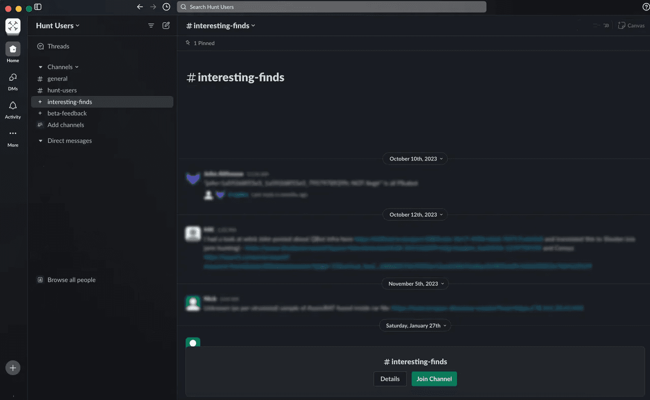 The Hunt community has it's own Slack space. The Hunt Users Slack space can be found by visiting: hunt-users.slack.com