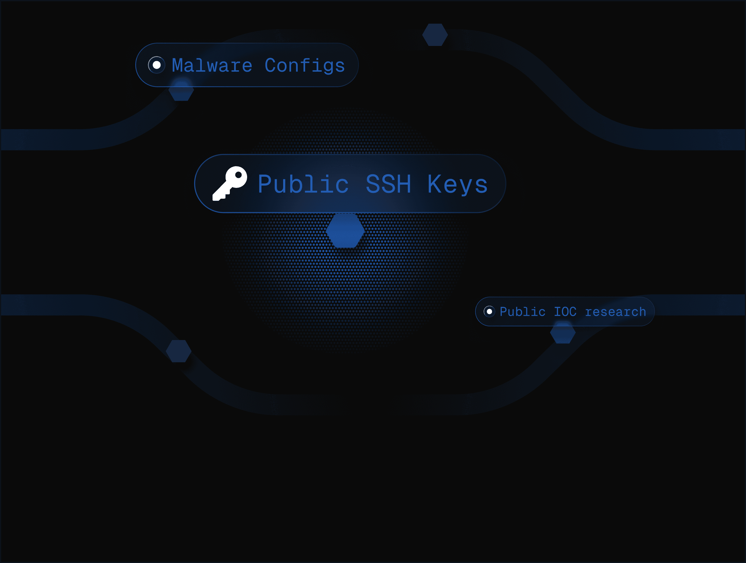 Pivot from one IP to associated SSH keys, IOCs, malware configs, and certificates.
